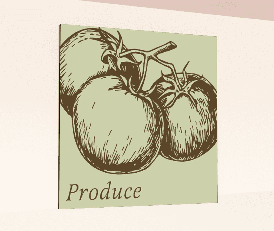 - The face of the sign is pale sage and has brown text that reads “Produce” with illustrated tomatoes on the vine.