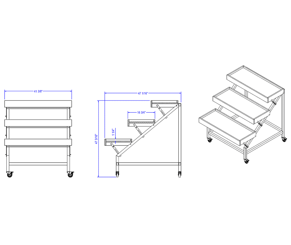 - Display has three adjustable, lipped trays.